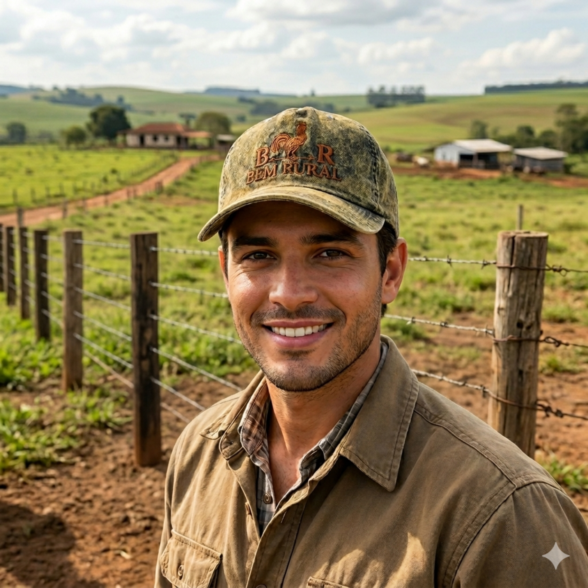 Símbolo do Campo: O bordado frontal com o galo da Bem Rural representa o despertar para o trabalho e o compromisso com a produção em nossa terra.