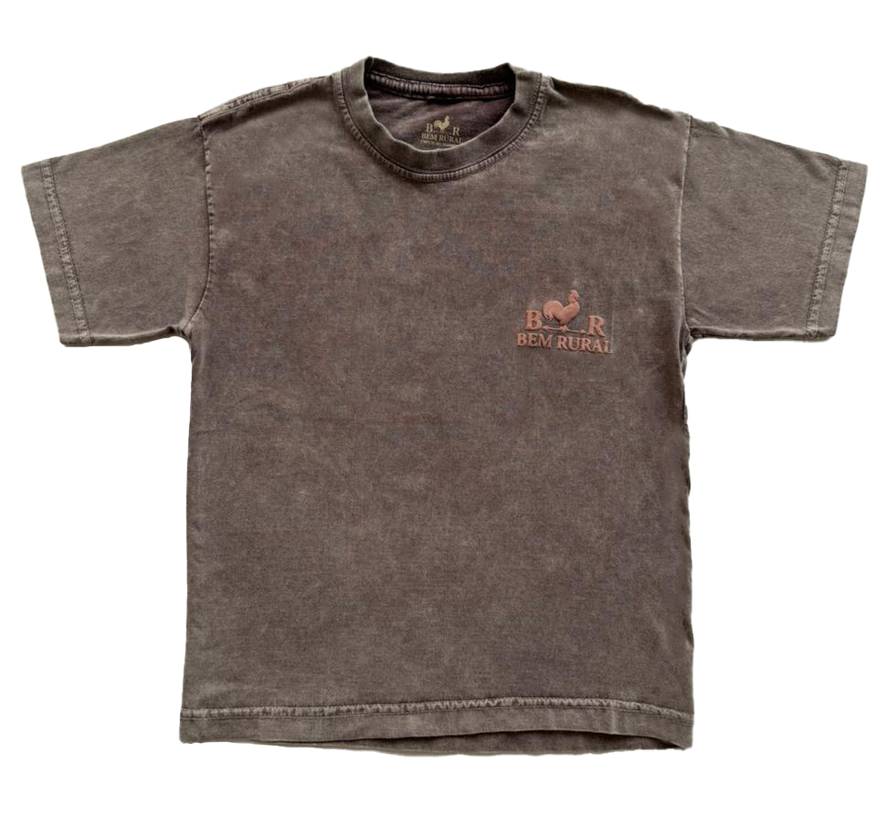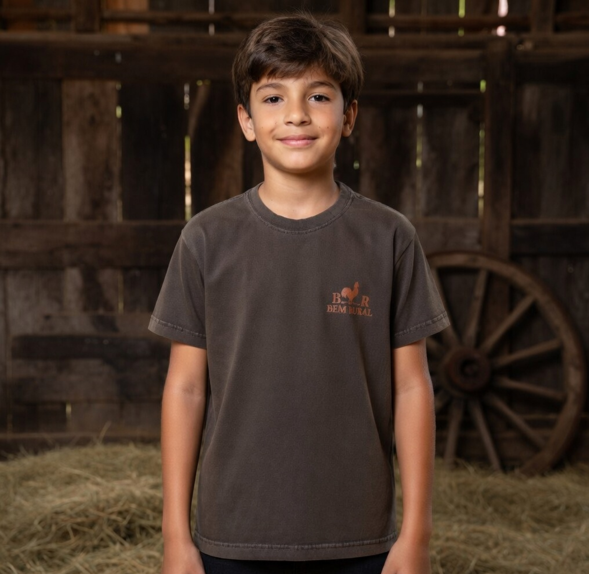 Camiseta infantil estonada na cor café com a essência rústica da Bem Rural. Estilo vintage e conforto máximo para os pequenos que amam o campo.