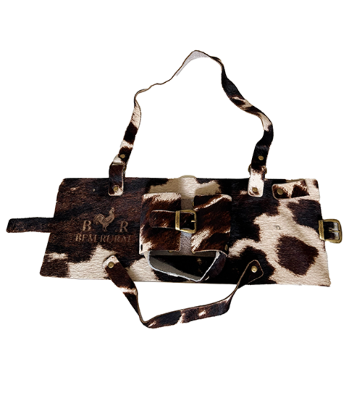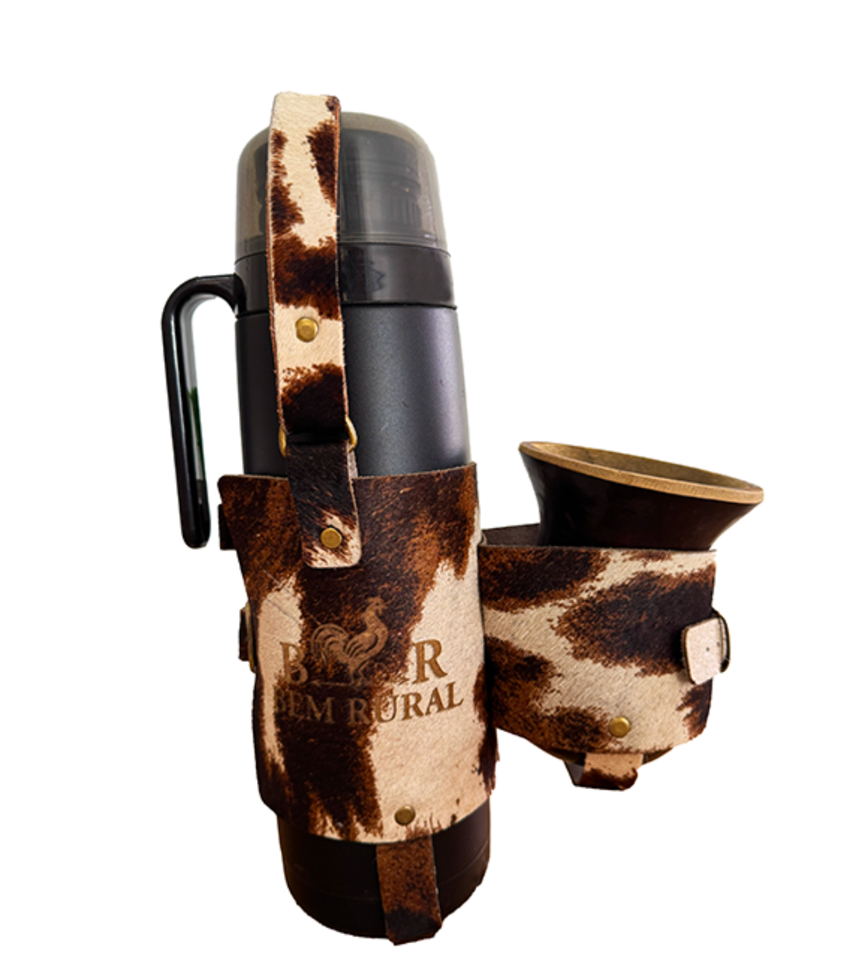 A Mateira Bem Rural em Pelagem Natural é um verdadeiro artigo de colecionador. Utilizando couro com pelo real, cada unidade apresenta um padrão de manchas orgânico e irrepetível, garantindo que sua mateira seja única no mundo. Os detalhes de fixação e as alças são feitos em couro resistente, proporcionando o suporte necessário para o peso do kit completo. O logotipo Bem Rural aplicado sobre a pelagem reforça a autenticidade de um produto feito por quem entende e vive a cultura rural.