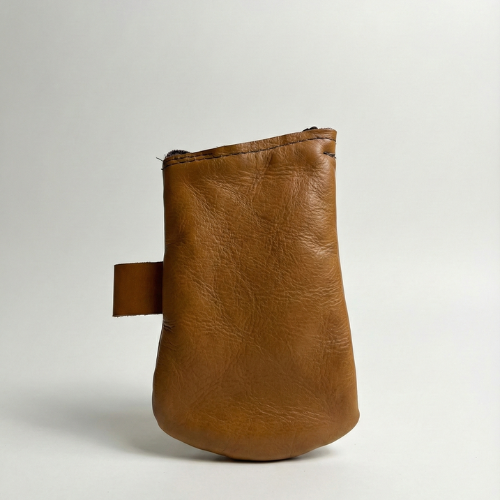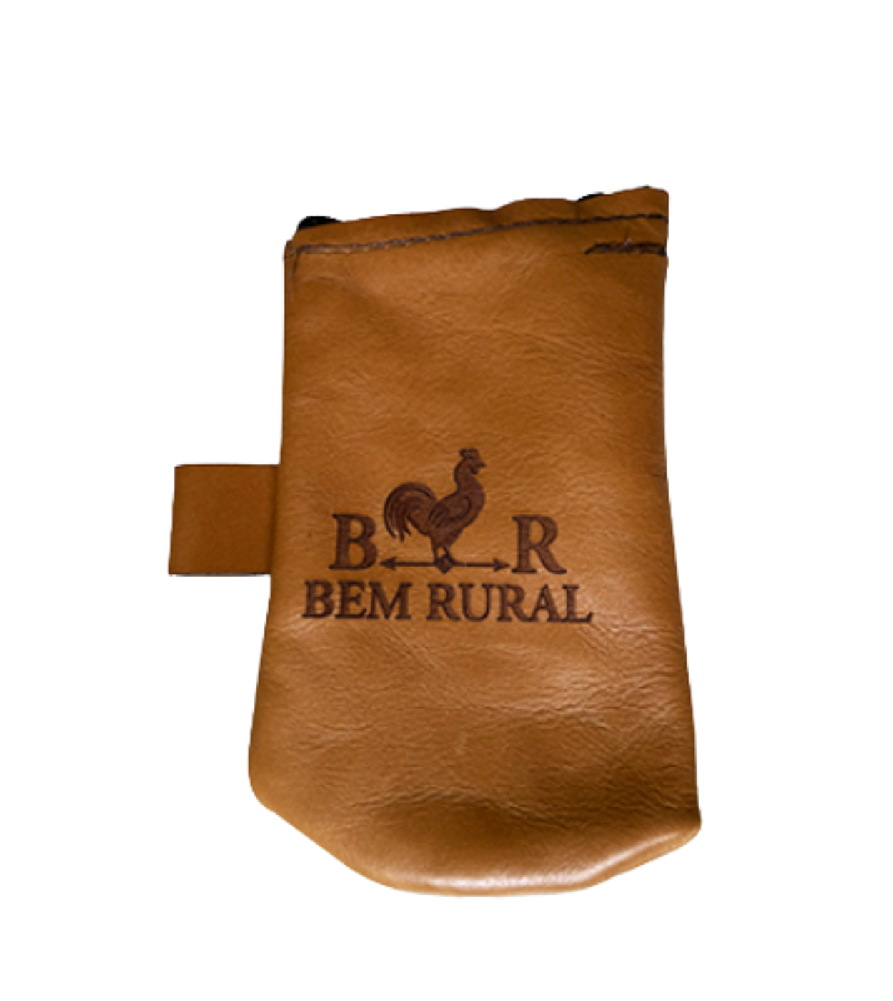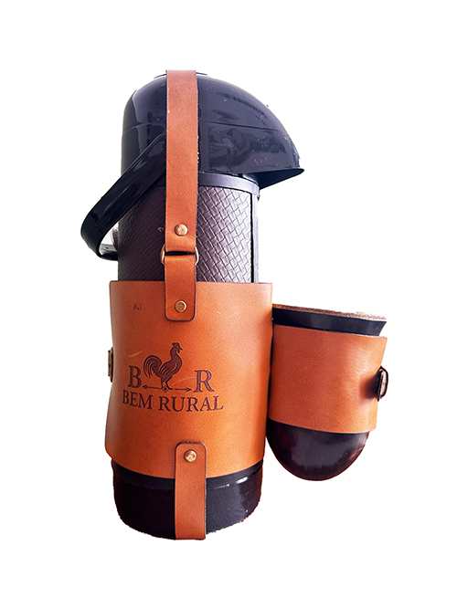 Porta erva em couro legítimo caramelo com logo Bem Rural gravado. Praticidade, durabilidade e o estilo clássico do campo para o seu mate.